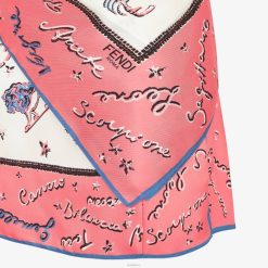 Vestido corto de un solo hombro con línea de fular y motivo anudado en hombro y lateral. confección en sarga de seda rosa y blanca, personalizada íntegramente con el motivo estampado astrología de fendi.