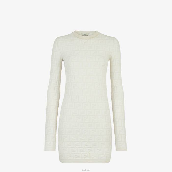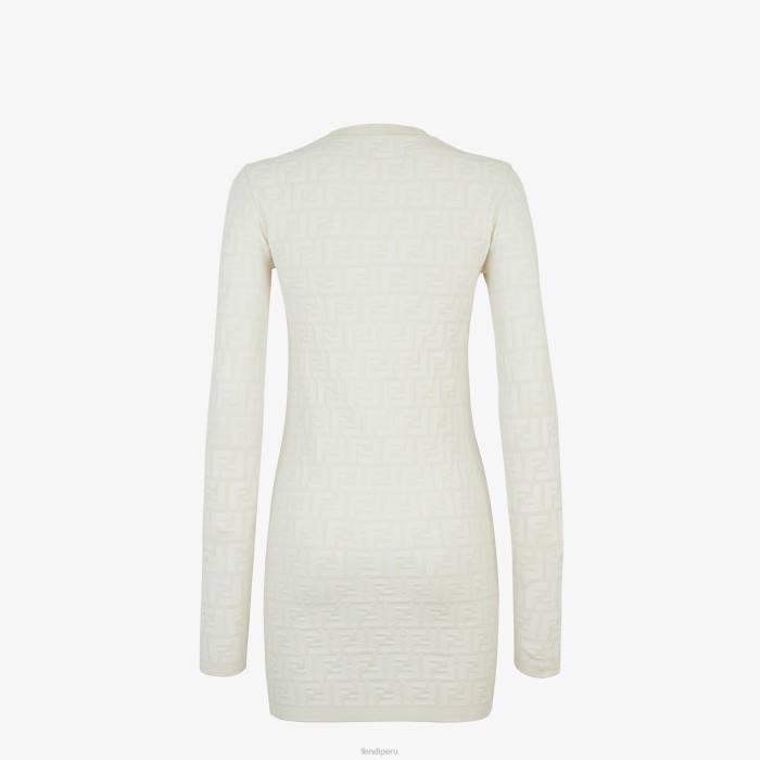 Vestido corto de manga larga y cuello redondo. equipado. Confección en punto de viscosa con motivo ff en relieve en toda la superficie en color blanco.