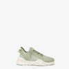 Zapatillas Fendi Flow con cordones elásticos ajustables y cierre de cremallera lateral. Personalizado con lengüeta de goma con logo grabado en la parte posterior del talón. fabricado en piel rosa. Detalles de tejido ff tono sobre tono. Suela running de goma de 35 mm con detalle de f diagonal blanca.