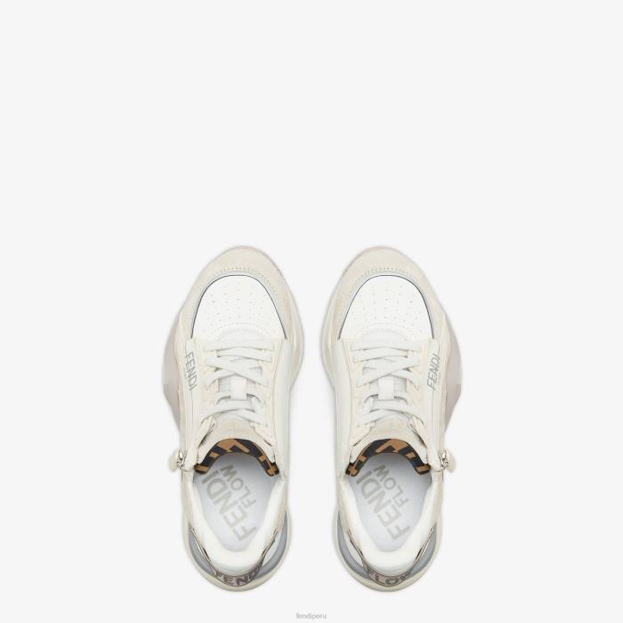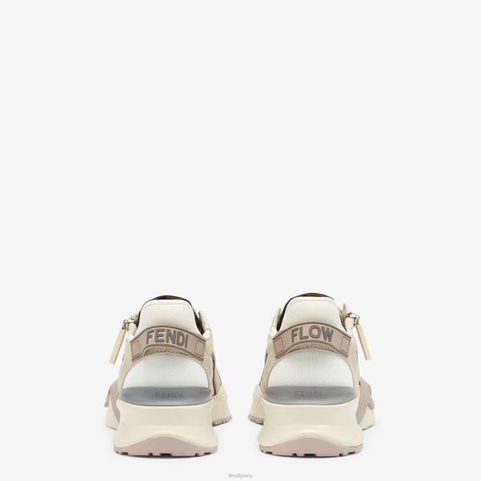 Zapatillas slip-on con cordones elásticos, cremallera lateral y suela ondulada con f grabada. Letras Fendi Flow grabadas en los talones. Confeccionado en ante blanco con inserciones de tejido técnico. adornado con detalles de lycra con motivo ff. Suelas ligeras de goma blanca con detalle de f diagonal rosa pálido.