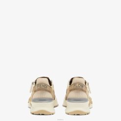 Zapatillas slip-on con cordones elásticos, cremallera lateral y suela ondulada con f grabada. Letras Fendi Flow grabadas en los talones. Confección en ante beige con inserciones de tejido técnico. adornado con detalles de lycra con motivo ff. Suelas ligeras de goma blanca con detalle de f diagonal beige.