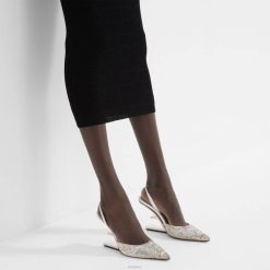 Primeros zapatos destalonados de Fendi con puntera cónica y correa en el tobillo. Confeccionado en tul con bordado de pedrería plateada por toda la prenda. decorado con bordado de cristales baguette creando un motivo ff. Tacón esculpido en forma de F diagonal en metal color paladio.