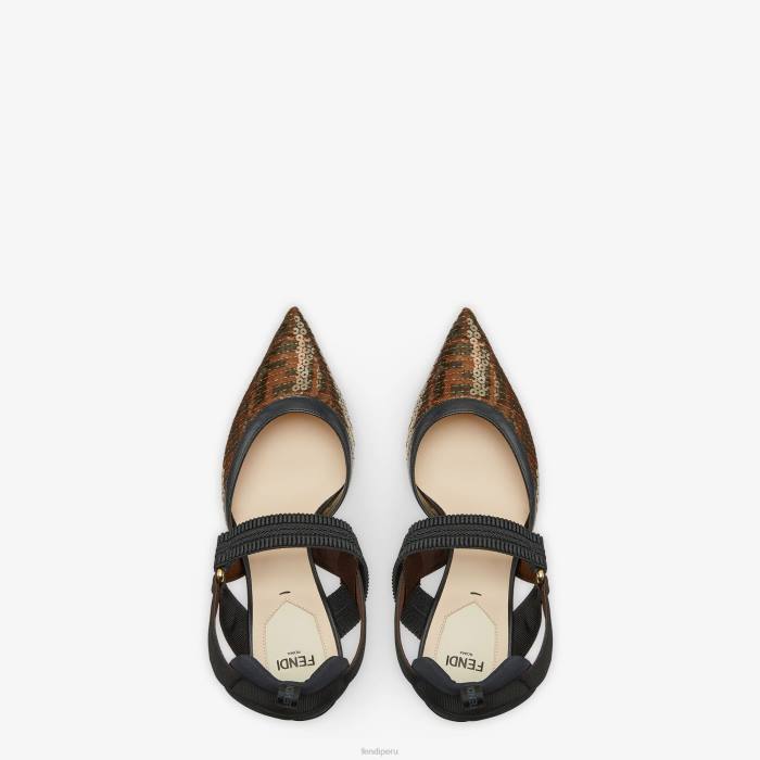 Colibri destalonado con puntera en punta y cintas elásticas que envuelven el pie. la suela está adornada con inserciones de goma. Confección en micromalla con motivo ff. rematado con bordado de lentejuelas color ámbar. el cojín acolchado y la lengüeta para el zapato de senderismo añaden un toque deportivo. tacón esmaltado en oro.