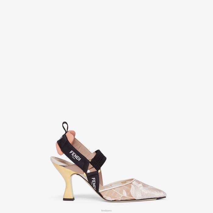 Colibri destalonado con puntera en punta y cintas elásticas que envuelven el pie. la suela está adornada con inserciones de goma. Confección en microrrejilla rosa claro con motivo ff. acabado con bordado floral blanco. el cojín acolchado y la lengüeta para el zapato de senderismo añaden un toque deportivo. tacón esmaltado en oro.