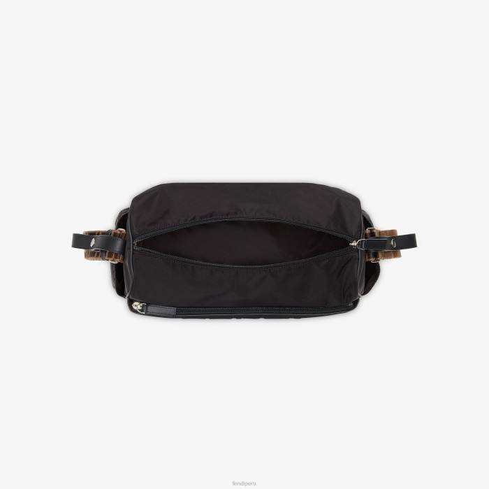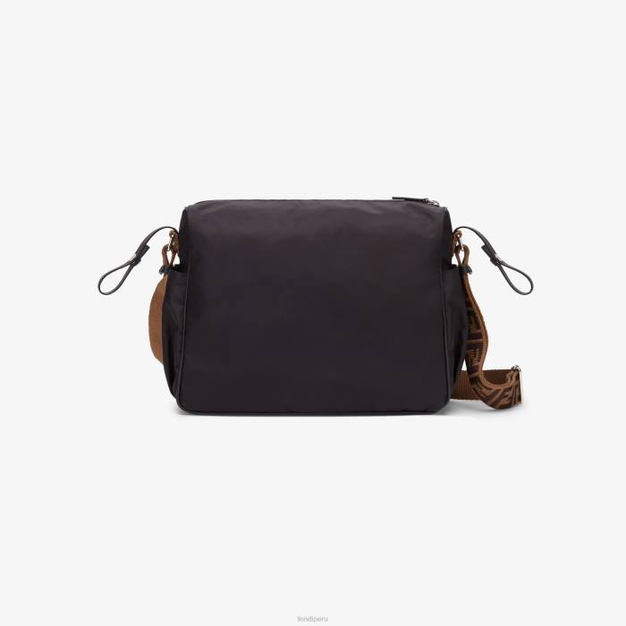Bolso pañalera de nailon negro con bolsillo delantero de piel y logo de Fendi en relieve. Bandolera de tela con logo ff tabaco y ganchos de piel para el cochecito. Forro interior de felpa y nailon con logo ff por toda la prenda.