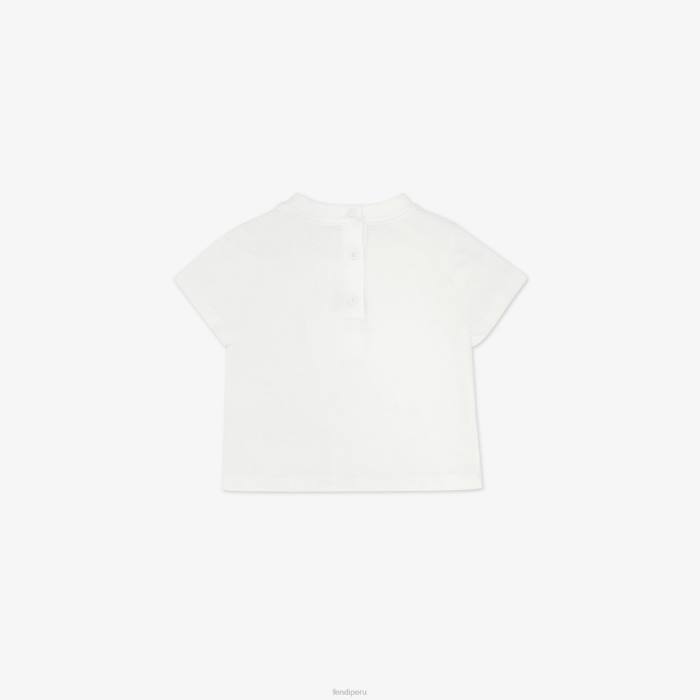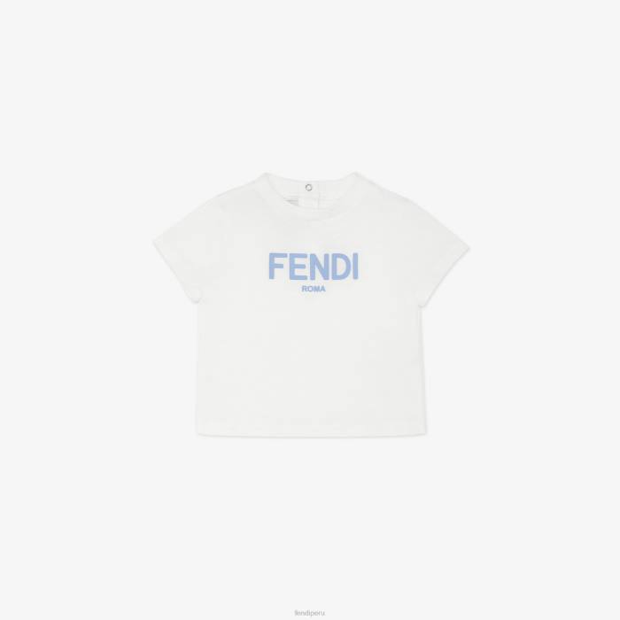 Camiseta para bebé de punto blanco con estampado fendi roma celeste y abertura con broche.