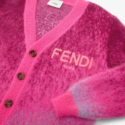 Cárdigan junior de lana mohair multicolor en rosa neón y fucsia con bordado fendi roma tono sobre tono en la parte delantera.