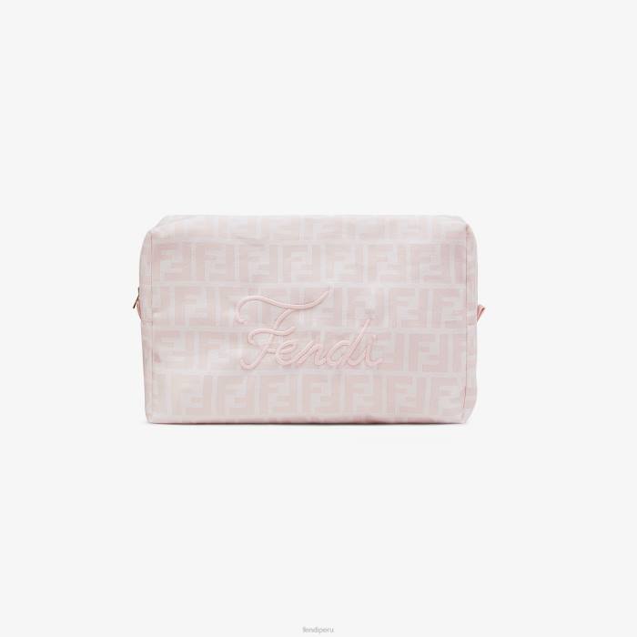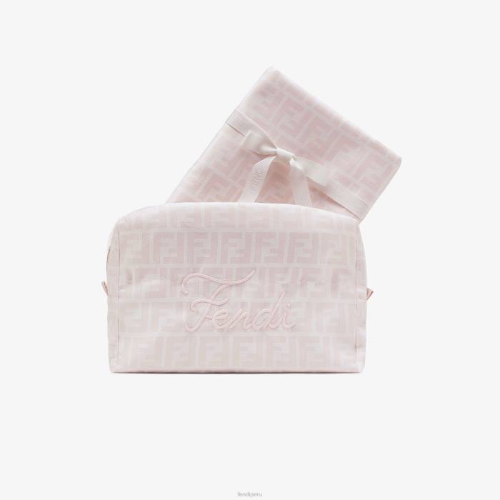 Conjunto para bebé de algodón y seda con logo ff tono sobre tono íntegramente en rosa, compuesto por un arrullo de 120 cm x 120 cm y un neceser con bordado fendi.