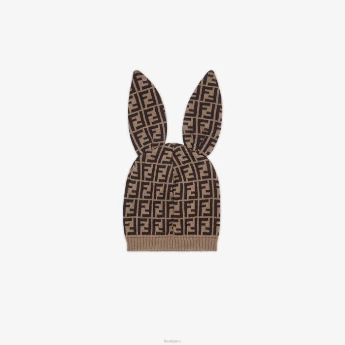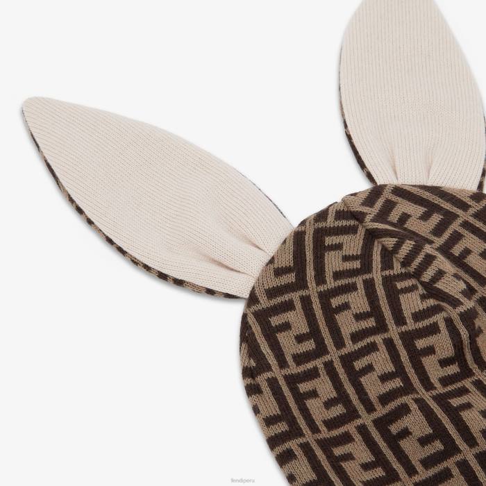 Gorro de algodón y cachemira con detalle de orejas de conejo y logo ff en tonos tabaco por toda la prenda.
