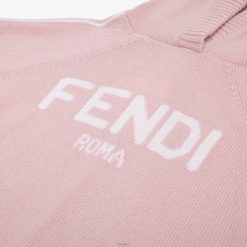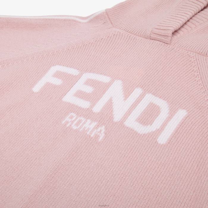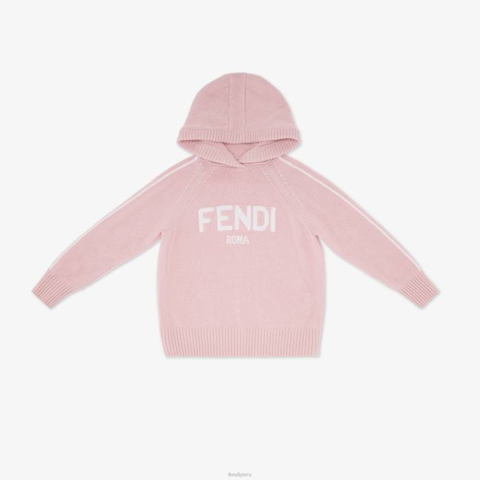 Jersey junior de puro cashmere rosa con capucha e intarsia con inscripción fendi roma en blanco en la parte delantera.