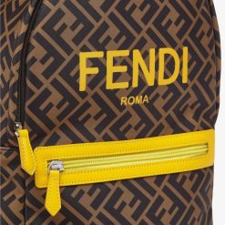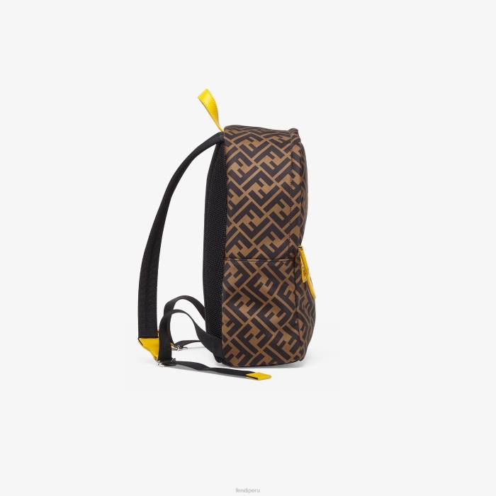 mochila junior íntegramente de nailon ff color tabaco con estampado fendi roma amarillo en la parte delantera. Bolsillo con cremallera amarillo en la parte delantera y asas de tela negra. dimensiones: largo: 23 cm (9 pulgadas) alto: 33 cm (13 pulgadas) ancho: 12 cm (4,75 pulgadas) ancho: 15 cm (6 pulgadas)