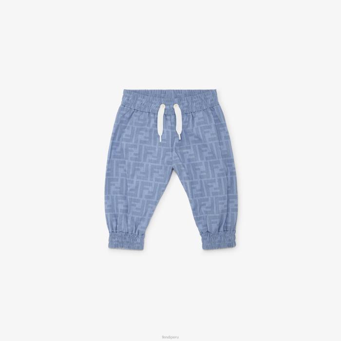 Joggers de bebé de cambray azul claro con cordón en la cintura, logo FF tono sobre tono por toda la prenda y bordado de Fendi Roma en la parte delantera.