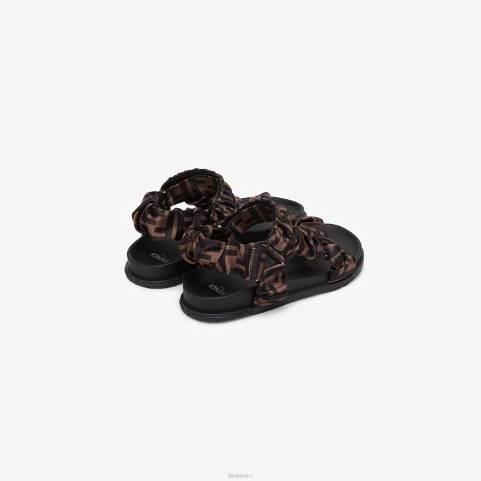Sandalias planas mini me con tiras anchas. Confección en raso elástico fruncido con motivo ff en marrón y tabaco.