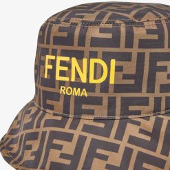 Gorro cloche junior reversible de nailon. amarillo con estampado fendi roma en un lado y logo ff color tabaco estampado en toda la superficie en el otro.
