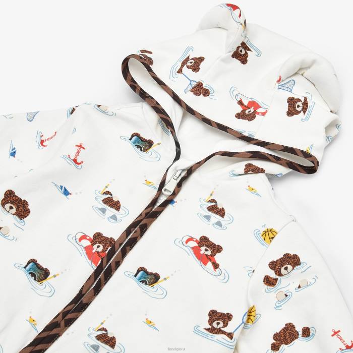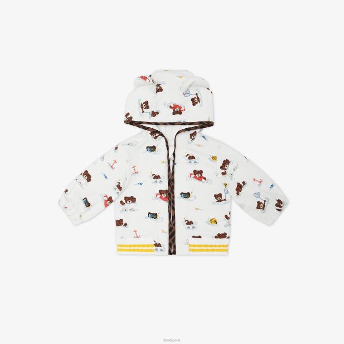 Sudadera de bebé de algodón con capucha y orejas. Estampado integral de ositos multicolor y ribetes de tela ff color tabaco.