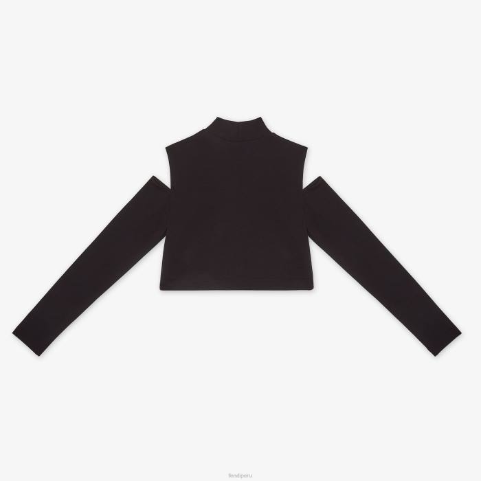 Top junior cropped de punto negro con abertura en el hombro y aplicaciones fendi 3d.