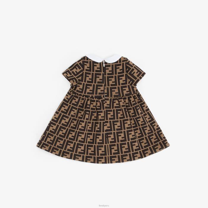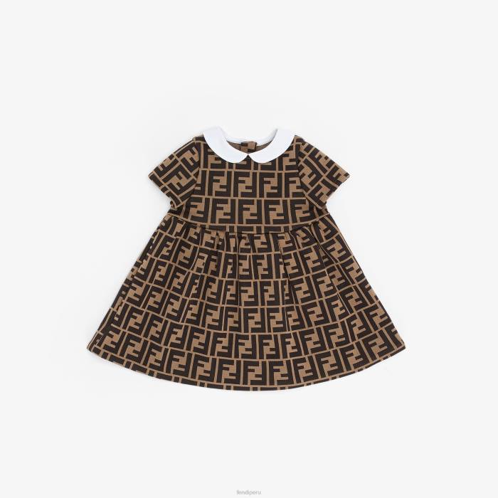 Vestido bebé niña de tejido jacquard con color marrón tabaco, logo ff por toda la prenda y cuello blanco.