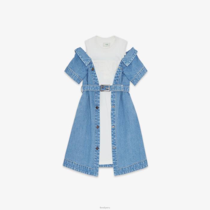 Vestido junior confeccionado en punto polar blanco con logo 3d fendi roma tono sobre tono en la parte delantera y denim con pequeños broches. aberturas en los hombros y cinturón con hebilla ff en la parte delantera.