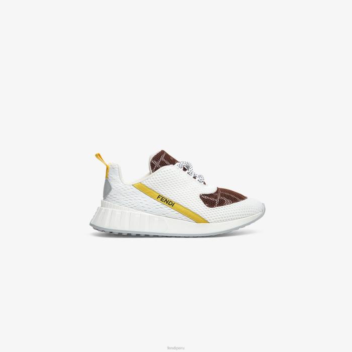 Zapatillas junior de material técnico blanco y malla con detalles fendi amarillos. Suela de zapatillas para correr y logo de la marca FF en tabaco en el frente.