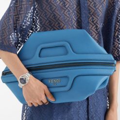 Caja redonda de 41 mm de acero inoxidable satinado y brillante en color plateado con inserción f de acero inoxidable tono sobre tono. Esfera azul degradado descentrada, índices y agujas plateados. Brazalete de acero tono sobre tono, 20/18 mm, con motivo ff grabado y hebilla desplegable.