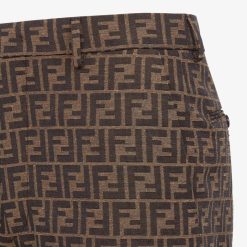 Pantalón bermudas con trabillas en cintura. bolsillos laterales y bolsillos de ribete con botón en la espalda. cierre de cremallera oculta. Confección en tejido con motivo ff jacquard marrón.