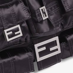 Bolso multibolsillos baguette confeccionado en nailon reciclado brillante de color negro, con cinco bolsillos de parche de diferentes tamaños. los bolsillos y la solapa delantera están decorados con el icónico cierre ff. adornado con cuero negro.