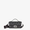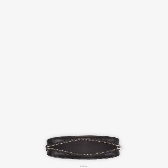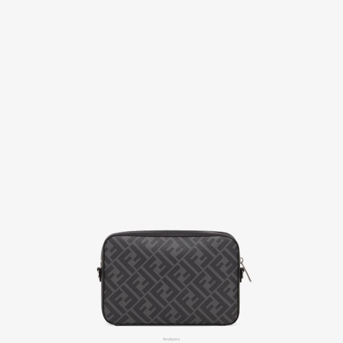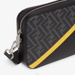 Bolso bandolera compacto con cierre de cremallera. la correa cruzada es ajustable y desmontable. Confección en tela texturizada de color gris con motivo ff. adornado con inserción de cuero negro y detalle de incrustaciones amarillas. Artículos metálicos con acabado en paladio.