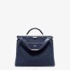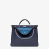 el interior está organizado en dos compartimentos divididos por una partición rígida, el frente presenta el icónico cierre giratorio, y allí Hay un cierre de cremallera en la espalda. El bolsillo interior extraíble es de piel azul claro por un lado y de tela ff por el otro. Artículos metálicos con acabado paladio.