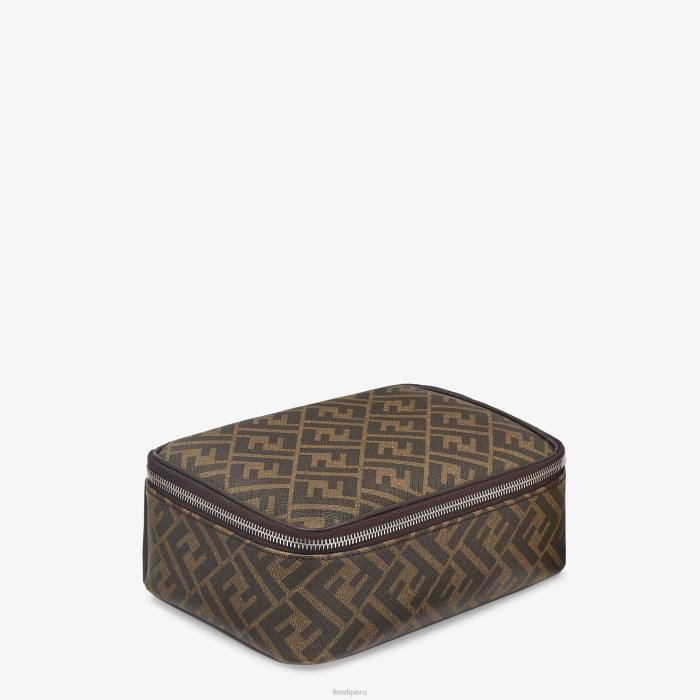 Organizador de viaje mediano confeccionado en tela con motivo ff en color marrón y tabaco. acabado con detalles de cuero marrón. Forro de tela a juego. Artículos metálicos con acabado en paladio.