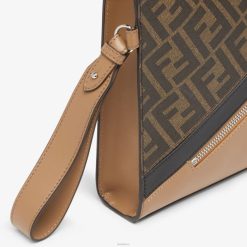Cartera de mano confeccionada en piel y tejido de color beige con motivo ff. adornado con una inserción diagonal de cuero marrón oscuro.