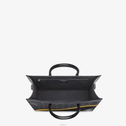 interior forrado, inserciones diagonales de piel amarilla, bolsillo con cremallera y detalles metálicos con acabado paladio.