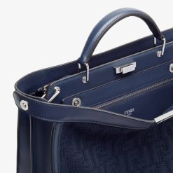 Bolso peekaboo iseeu mediano, confeccionado en piel azul oscuro y jersey perforado ff.