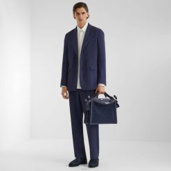 el interior está organizado en dos compartimentos divididos por una partición rígida, el frente presenta el icónico cierre giratorio y hay un cierre de cremallera en la parte posterior. El bolsillo interior extraíble está confeccionado en piel azul oscuro por un lado y tejido ff en gris por el otro. Artículos metálicos con acabado paladio.
