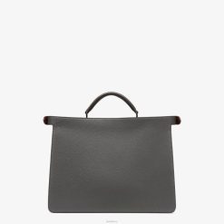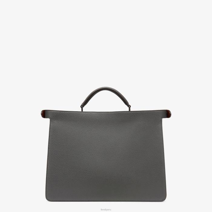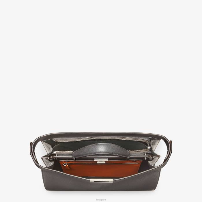 Bolso peekaboo iseeu, tamaño mediano, con dos compartimentos divididos por una partición rígida, presenta el icónico cierre giratorio en la parte delantera, cierre de cremallera en la parte posterior y bolsillo para tableta con cremallera y cierre giratorio. bolsillo interno desmontable. Se puede llevar en la mano o al hombro gracias a su asa y a la bandolera ajustable y desmontable. Confeccionado en piel cuoio romano en color gris asfalto. Forro de piel lisa gris y burdeos. El bolsillo está confeccionado en piel en tonos naturales con las letras fendi roma en un lado y tela ff en el otro. Artículos metálicos con acabado en rutenio ultra negro