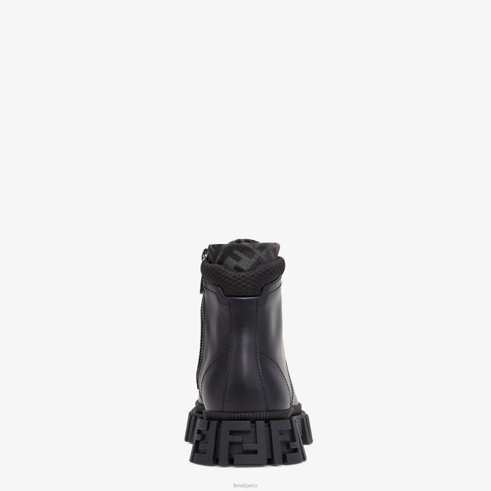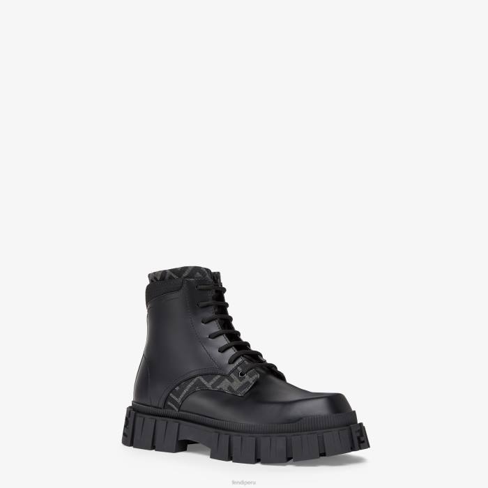 Botines Fendi Force con cordones. Confección en piel negra con detalles en tejido jacquard ff en gris y negro. Cremallera en el interior para hacerlos más cómodos. suela de goma ligera con detalle ff en relieve en el talón.