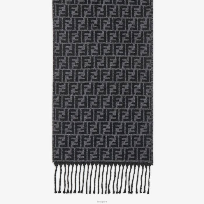 Bufanda rectangular confeccionada en lana con motivo ff estampado en gris y negro. adornado con flecos en los extremos.