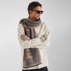 Pañuelo rectangular confeccionado en lana y seda. un lado tiene la marca macro fendi roma en gris y beige, mientras que el otro es de color liso.