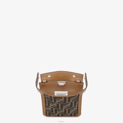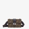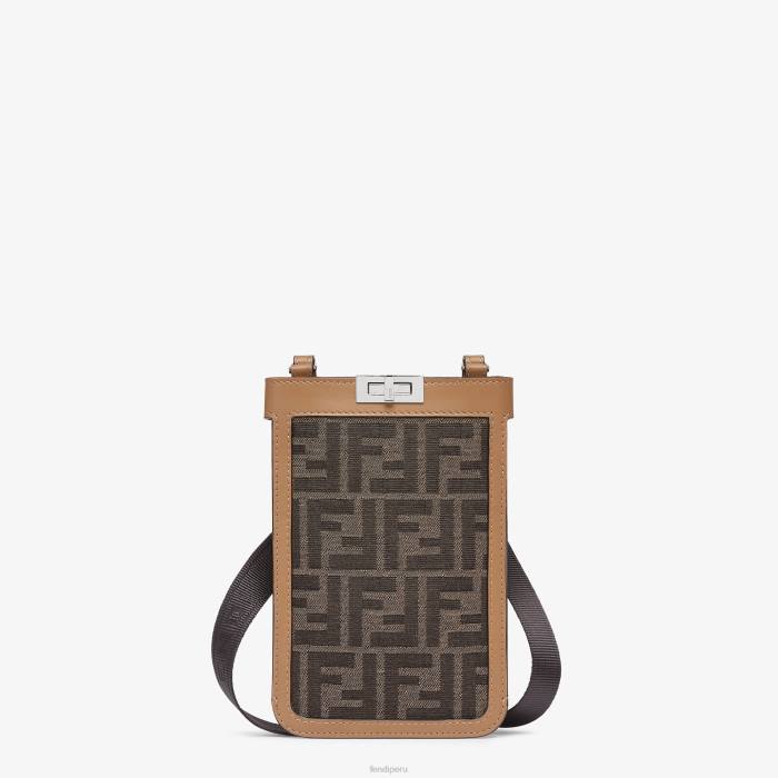 Funda para teléfono peekaboo con cierre giratorio y correa para el hombro extraíble. Confección en tejido reciclado con motivo ff en color marrón y tabaco. adornado con perfiles de cuero beige. Artículos metálicos con acabado en paladio.