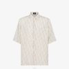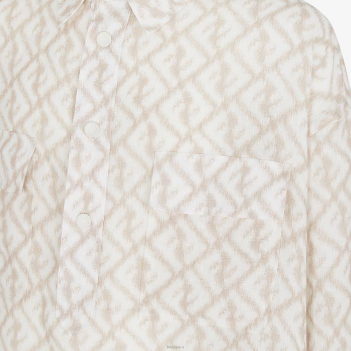 Camisa oversize con cordón en el bajo y bolsillos de parche con solapa en la parte delantera. Mangas escotadas. cierre de botón. Confección en lino con motivo ff diagonal efecto ikat estampado íntegramente en blanco y beige.
