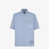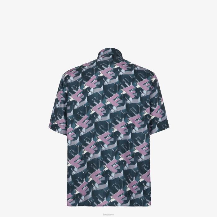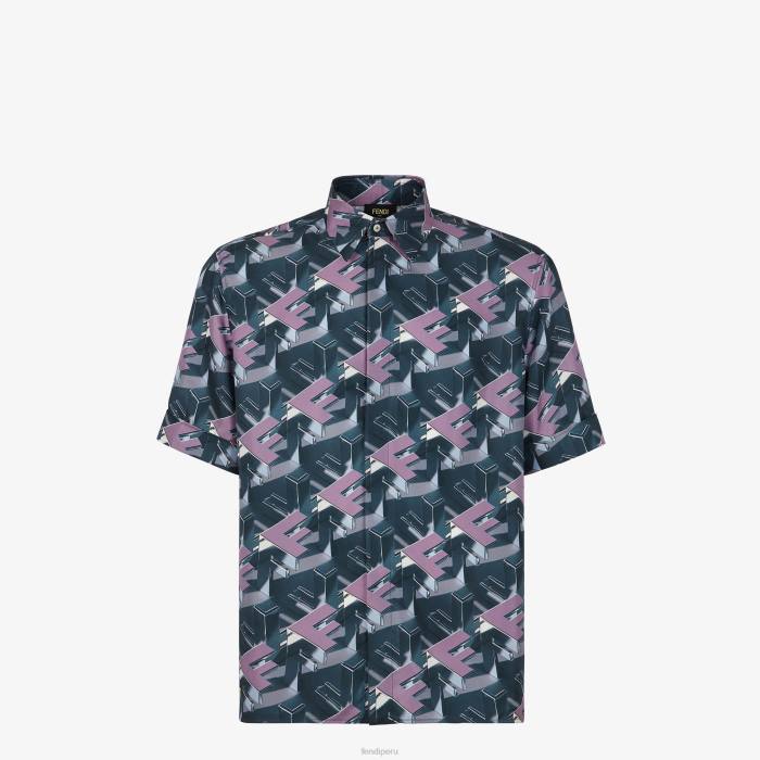 Camisa con cuello estilo italiano y manga corta. cierre de botón oculto. confeccionado en seda, con el motivo del bloque de Fendi estampado en un efecto 3D en color lila y verde.