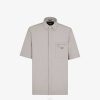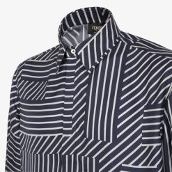 Camisa con cuello estilo italiano y manga corta. cierre de botón oculto. Confección en seda azul con estampado oversize del motivo Fendi Shadow.