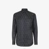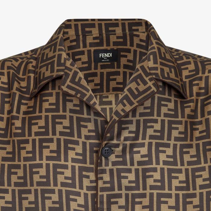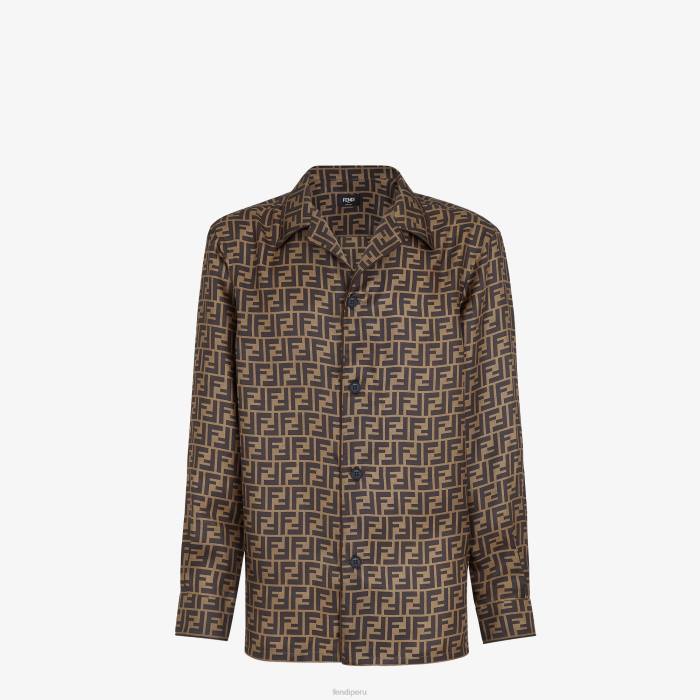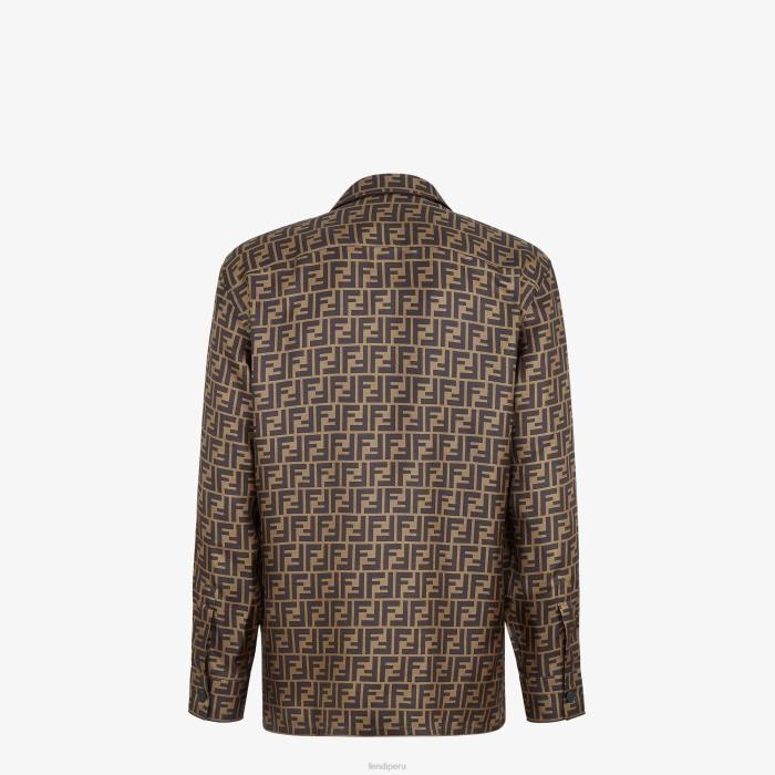 camisa con cuello cubano. Cierre con botones visibles tono sobre tono. Confección en seda con estampado del motivo ff por toda la prenda en tonos marrones. el cuello, el cierre y los puños están adornados con ribetes en contraste.