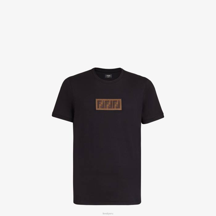 camiseta de corte regular. cuello redondo y manga corta. confeccionado en suave jersey de algodón negro. personalizado con parche de ante y motivo ff marrón.
