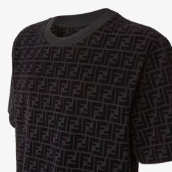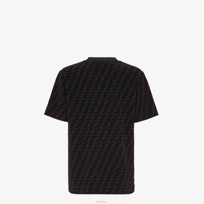 Camiseta oversize de manga corta y cuello redondo. Confeccionado con piqué de algodón negro. decorado con motivo ff flocado tono sobre tono estampado por toda la superficie.