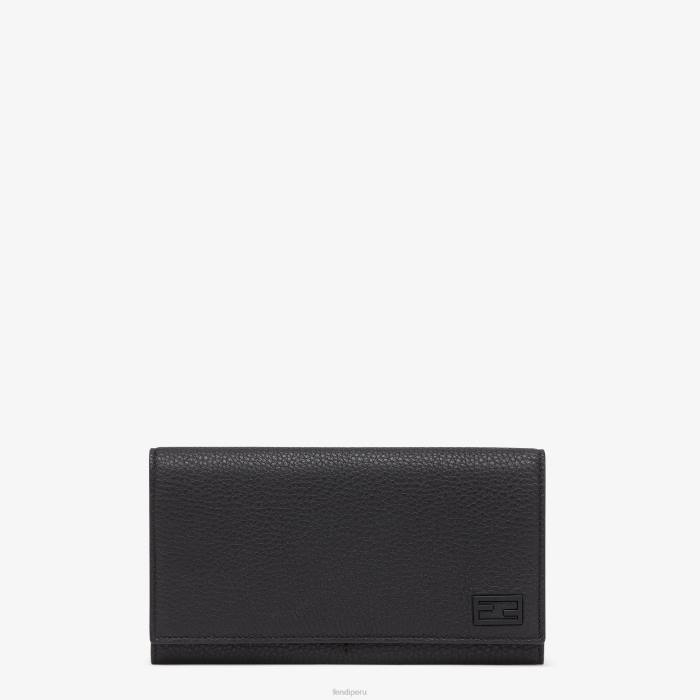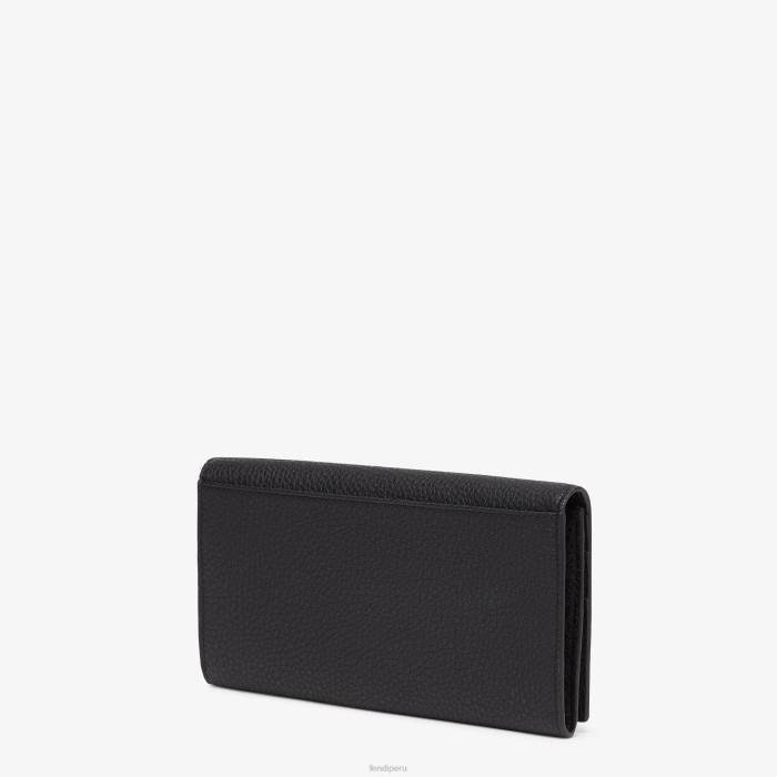 Cartera continental con solapa. bolsillo plano en la espalda. El interior cuenta con ranuras para tarjetas, un espacioso compartimento reforzado para billetes y un bolsillo con cremallera. Confección en piel cuoio romano negra. adornado con un motivo baguette ff esmaltado tono sobre tono.