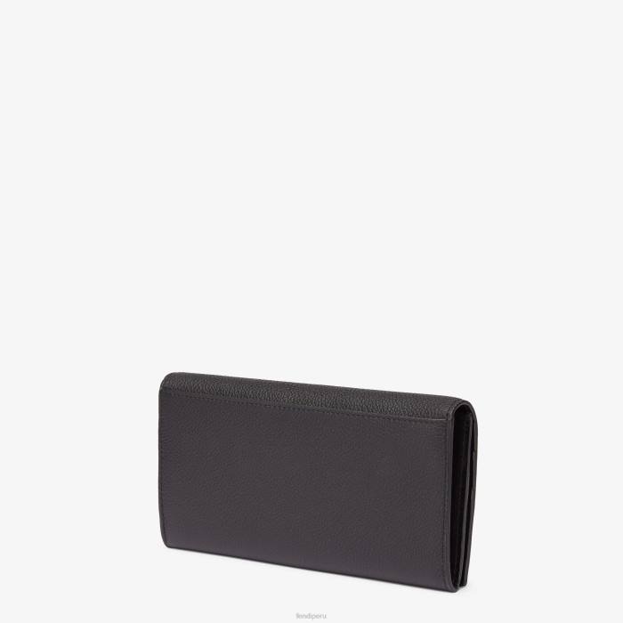 Cartera continental con solapa. bolsillo plano en la espalda. El interior cuenta con ranuras para tarjetas, un espacioso compartimento reforzado para billetes y un bolsillo con cremallera. Confeccionado en piel flor negra. Letras Fendi Roma y artículos metálicos con acabado de rutenio ultranegro.