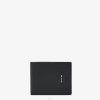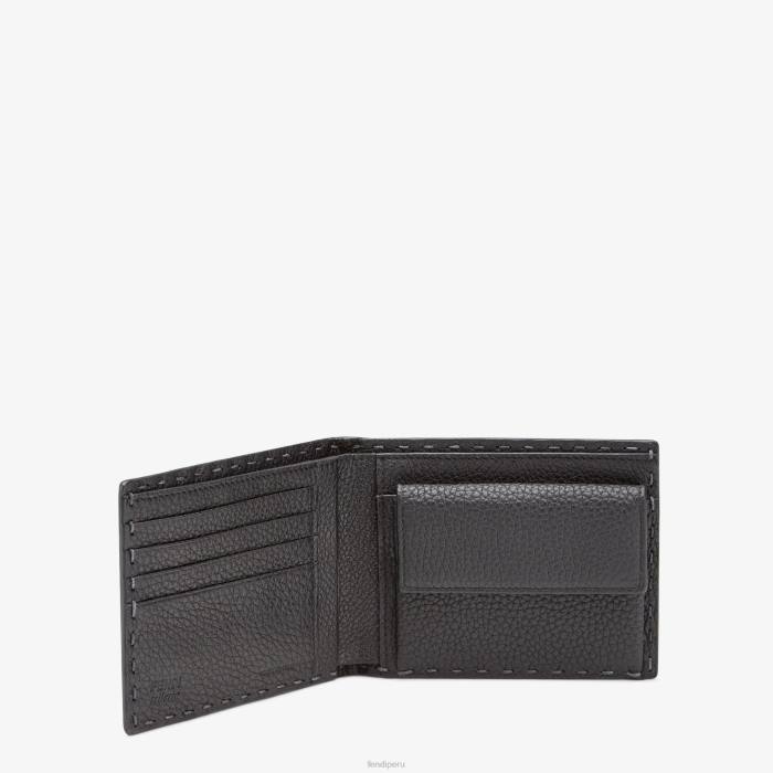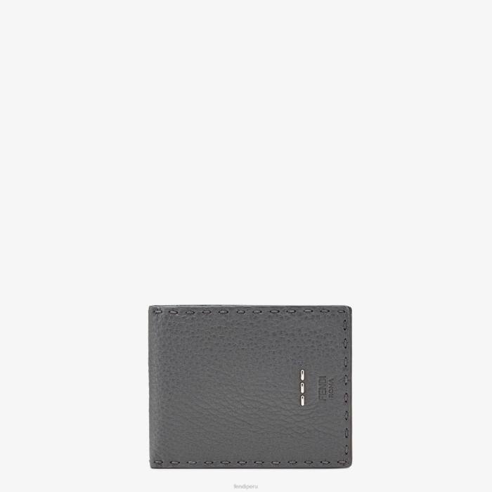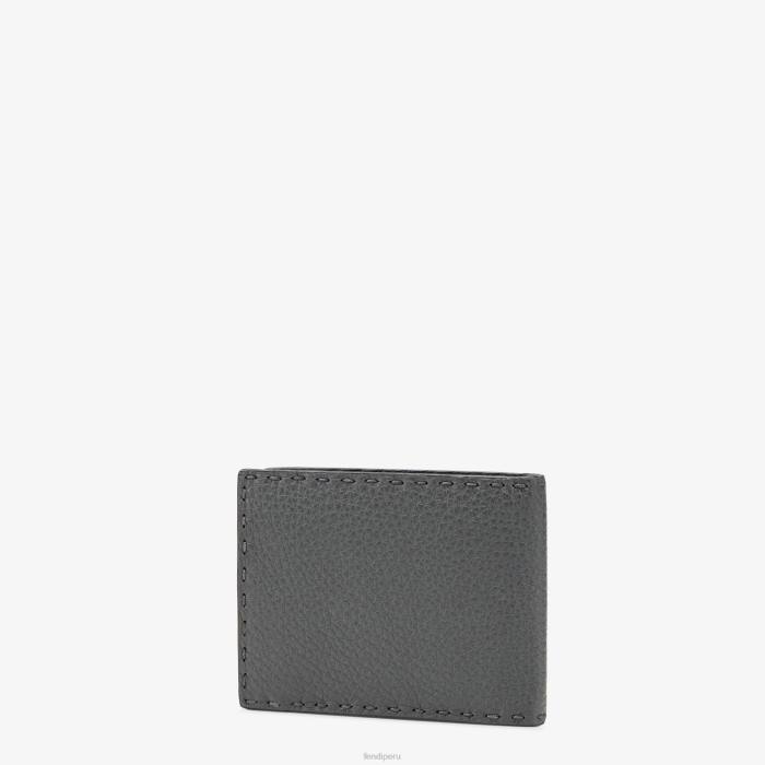 Cartera plegable, organizada en su interior con cuatro ranuras para tarjetas, dos compartimentos para billetes y un monedero con botón a presión. Confección en piel cuoio romano gris. Artículos metálicos con acabado en paladio.