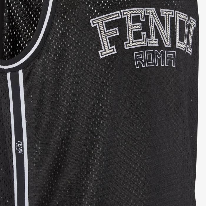 Chaleco estilo baloncesto de malla técnica negra. personalizado con letras fendi roma en contraste bordadas en la parte delantera. Bordes de punto a rayas en blanco y negro.