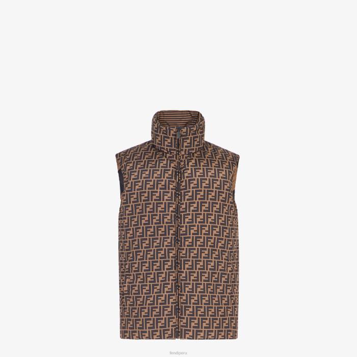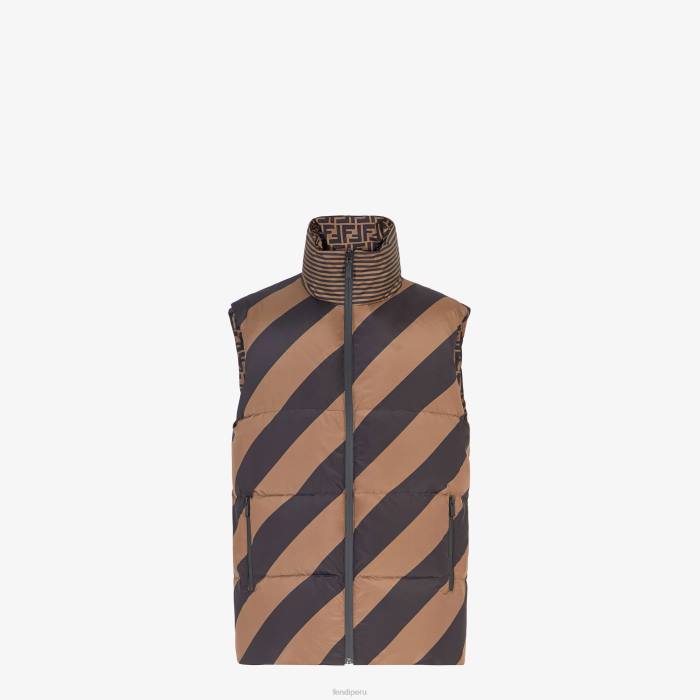 Chaleco acolchado reversible con bolsillos a ambos lados. cierre de cremallera. fabricado con nailon marrón. un lado está acolchado con un diseño de líneas diagonales en color tabaco, mientras que el otro está personalizado con un motivo ff integral del mismo color.