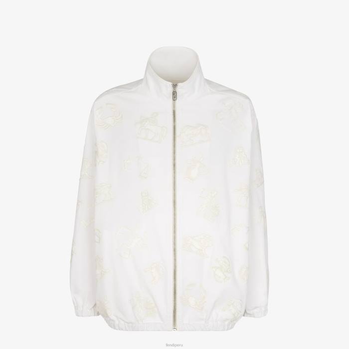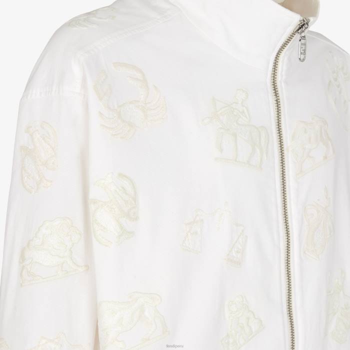 Cazadora oversize de manga larga y cuello alto. puños y dobladillo elásticos. Cierre con cremallera visible. Confeccionado en tejido de algodón elástico blanco. adornado con un motivo de astrología fendi bordado en el mismo color.